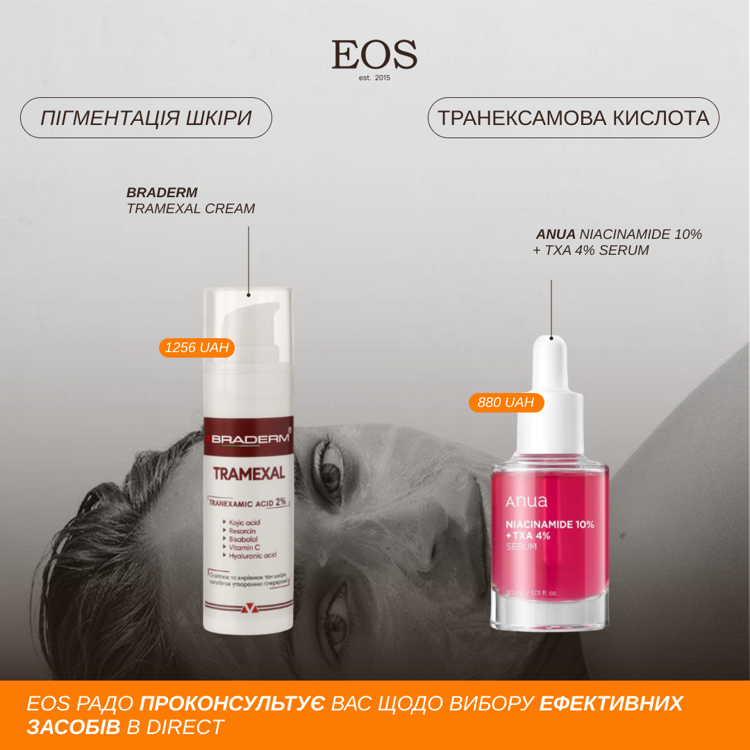 Один з найпопулярніший активів від пігментації є ТРАНЕКСАМОВА КИСЛОТА. Така іронія, що позитивні властивості транексамової кислоти на шкіру виявили як побічну реакцію при лікуванні гематологічних захворювань (хвороби крові). Лікарі звернули увагу що у пацієнтів які лікуються транексамовою кислотою значно висвітлюються пігментні плями. От її і почали викристовувати в косметології як актив для лікування мелазми. А оскільки транексамова кислота є традиційним лікарським засобом то вона достатньо досліджена.