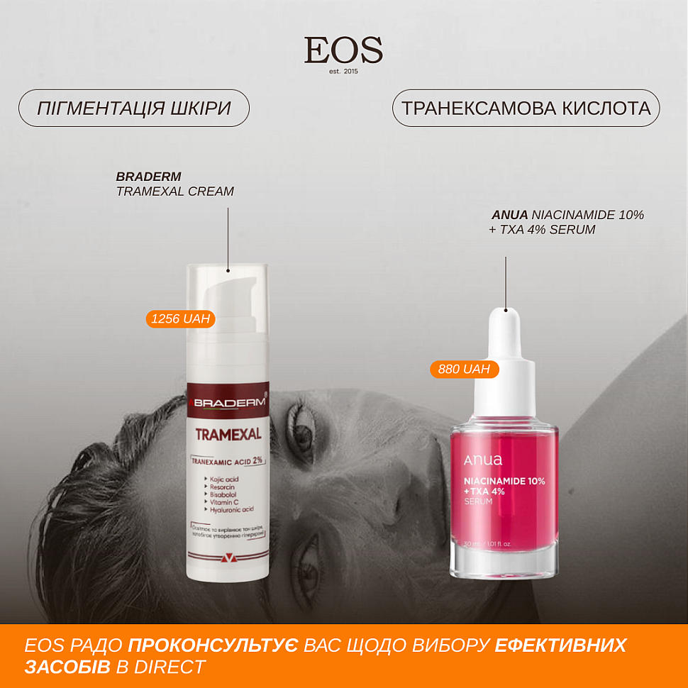 Транексамова кислота ідеальний компонент для людей схильних до гіперпігментації які часто перебувають на сонці. Вона може бути як в комбінації з сонцезахисними продуктами так і після для відновлення фотопошкоджень.